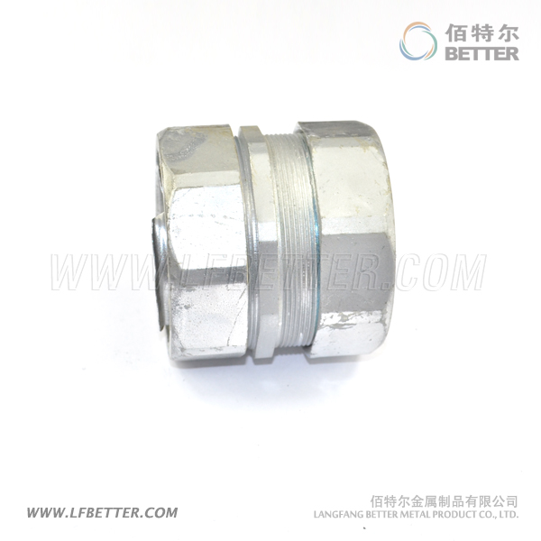 由多個(gè)配件組合而成的復(fù)合連接器,一端為外管螺紋,一端為可撓金屬電線保護(hù)套管螺紋。材質(zhì)為鋅鋁合金,表面鍍鉻。